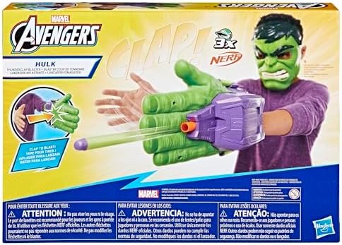 Gear up for superpowered action and adventure with the Marvel Avengers Hulk Thunderclap Blaster roleplay toy, powered by NERF! Kids can load 1 of the 3 included projectiles into the blaster, then prime it for launch by pulling back on the handle. To blast, simply clap hands together just like Hulk in the entertainment and comics. Includes storage for 2 additional darts on the sides of the blaster. Makes a great accessory to any Hulk costume. Look for more cool Marvel Avengers Super Hero toys for boys and girls to build a collection of action figures, toy vehicles, and roleplay gear, or give as gifts. (Each sold separately. Subject to availability.) Avengers assemble! Copyright MARVEL. All trademarks and registered trademarks are the property of their respective owners. HASBRO and all related trademarks and logos are trademarks of Hasbro, Inc.