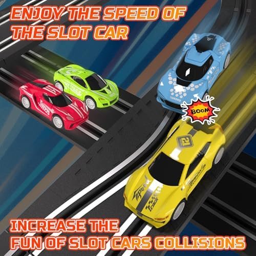 From the brand Previous page Car Toy for kids age over 3 2Pack Hydration Backpack Next page Product description Slot Cars for 3+ Year Old Chritsmas Birthday Gift LED lights and fun track design with overpass This is an entertaining, interactive set that can keep kids (and parents) engaged for hours. The video showcases the product in use.The video guides you through product setup.The video compares multiple products.The video shows the product being unpacked. slot race car track Merchant Video DIY by Customer What a blast, got this set to play race cars with my grandson. The track is easy to assemble and man do the cars go fast. Not like the old days when the inside car had to slow down for the corners, this track can handle a car at full speed without flying off the track. Great quality and seems really durable, we will be playing every day. The video showcases the product in use.The video guides you through product setup.The video compares multiple products.The video shows the product being unpacked. slot car race track set Merchant Video 2 Lanes with Full 360° Loops This one does come with 4 different cars and everything. This is a lot of fun. This is an absolute blast. The video showcases the product in use.The video guides you through product setup.The video compares multiple products.The video shows the product being unpacked. race car track set Merchant Video